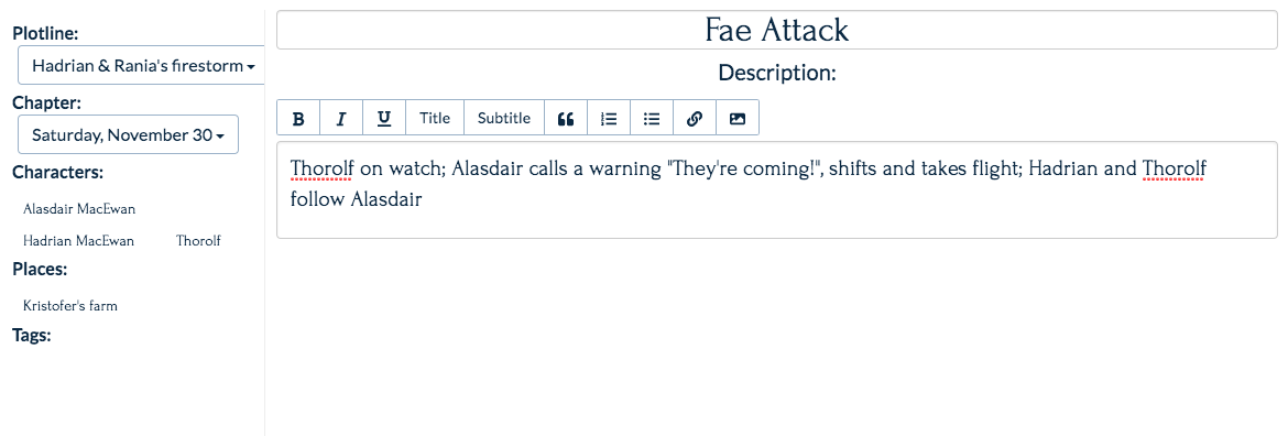 Here I can add a more detailed description of events, plus I can choose the characters in the scene from my character list, and choose the location from my list of places. This means that later, I can filter the timeline by character or location. This is hugely useful when cross-checking what secondary characters have witnessed or heard. (I don’t use the tags as yet.)