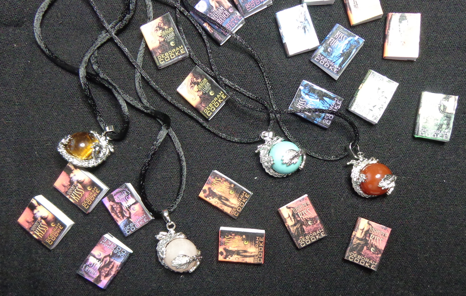 There’s also an Early Bird bonus for the Book Worm swag pack – the first twenty sold include a dragon ball pendant and a Dragonfire book charm. There are lots of book charms here, all of which still need to be drilled and have their hardware added.