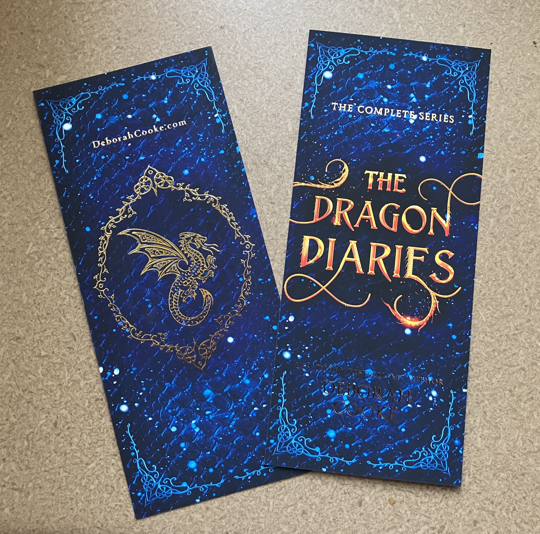 Here are the luxe bookmarks with gold foil. These will have gold tassels added to them by yours truly. On one side the dragon and my url are in gold foil, and on the other the smaller type.