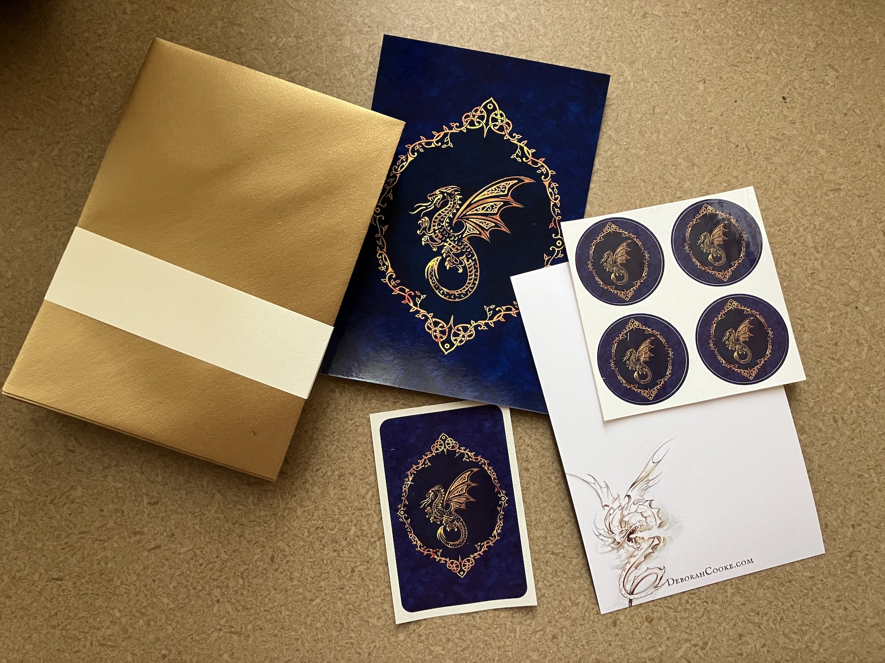 At left are the gold envelopes available from this printer. I always order them to go with my thank-you cards, which have the blue dragon on one side and the drawn one on the other this time. I chose two sizes of sticker this time, the little round ones that I love and some bigger rectangular ones that work well with the oval dragon. I have navy and gold tissue for wrapping the books, so everything will be matchy. 🙂