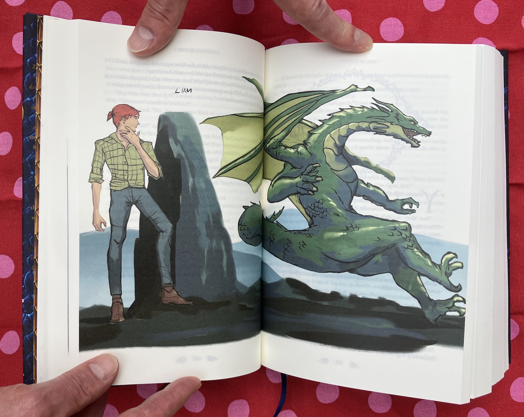 There are four colour illustrations in the book, all done by Jaka Prawira. Each features one of the four characters – Zoë, Garrett, Liam and Nick – in both their dragon and human forms. These were printed on character cards for the Kickstarter backers.